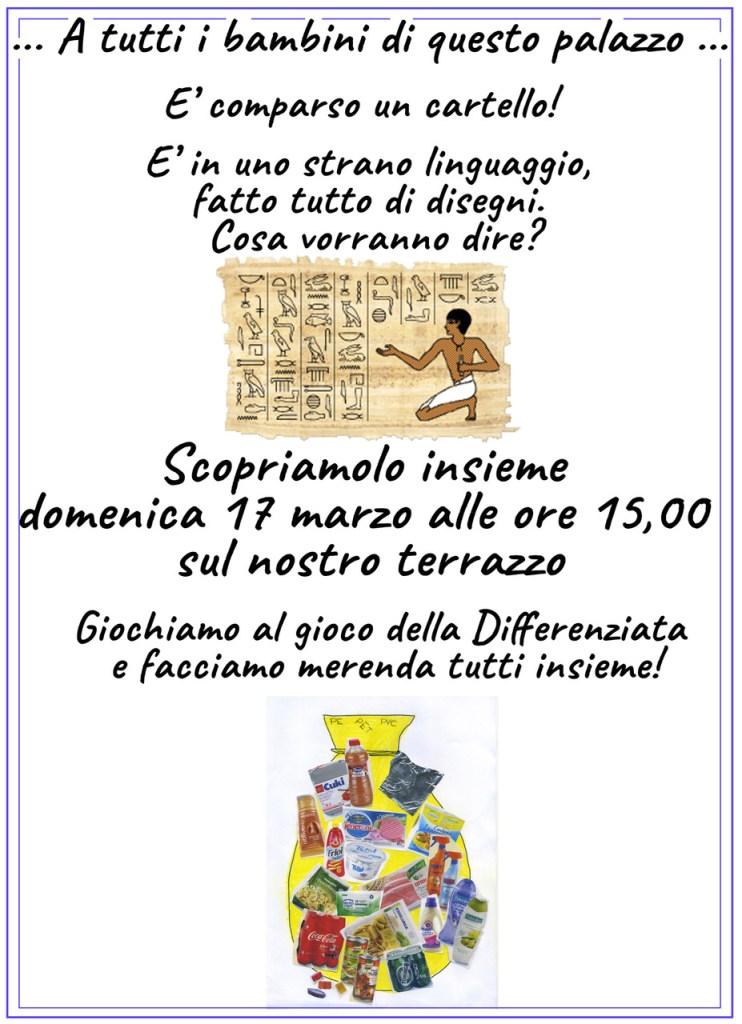 Su richiesta di alcuni condòmini di questo Palazzo con evidenti difficoltà socio-economiche, abbiamo coinvolto con un gioco i bambini e ragazzi. Tutto è cominciato con questo cartello apposto in portineria: