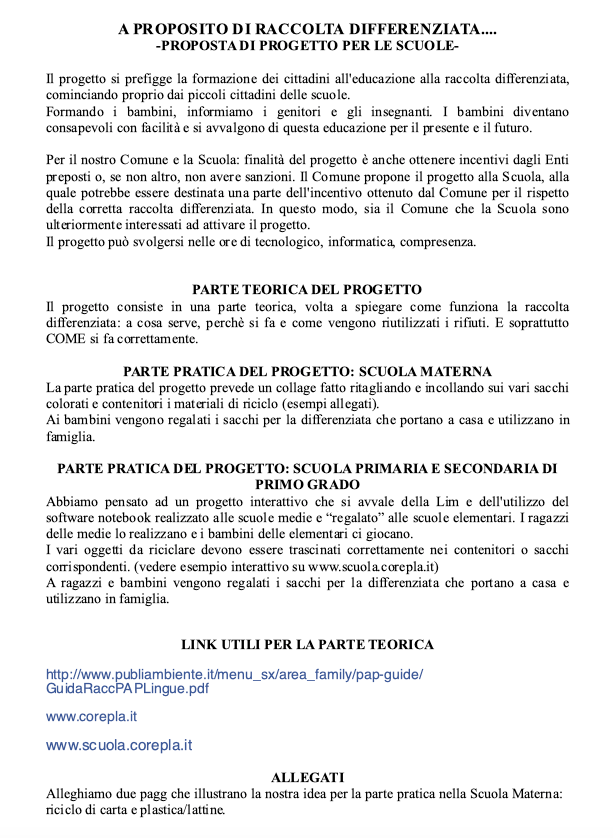 La maniera più semplice per imparare è capire il perché di ciò che stiamo facendo, e di praticare giocando. La nostra idea di progetto consentirebbe nel giro di breve di educare i bambini fin da piccolissimi alla corretta raccolta differenziata, giocando e confrontandosi anche a casa con i genitori, i bambini mettono in pratica e i genitori li supportano e imparando per via indiretta le regole. Senza alcuna spesa da parte di nessuno.Inoltre, questo Progetto consentirebbe di realizzare cartelloni e disegni che abbiano un fine pratico e utile, non solamente artistico o tecnico. Ogni dubbio che dovesse nascere all’interno di questo Progetto, sarebbe portatore di rete tra Scuola, Comune, Famiglie, come opportunità di confronto e risoluzione.Tutto questo è di importanza cruciale nella formazione di cittadini consapevoli e responsabili.