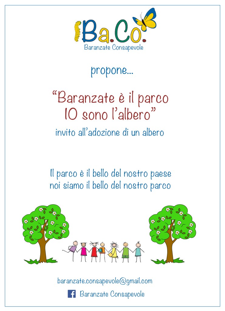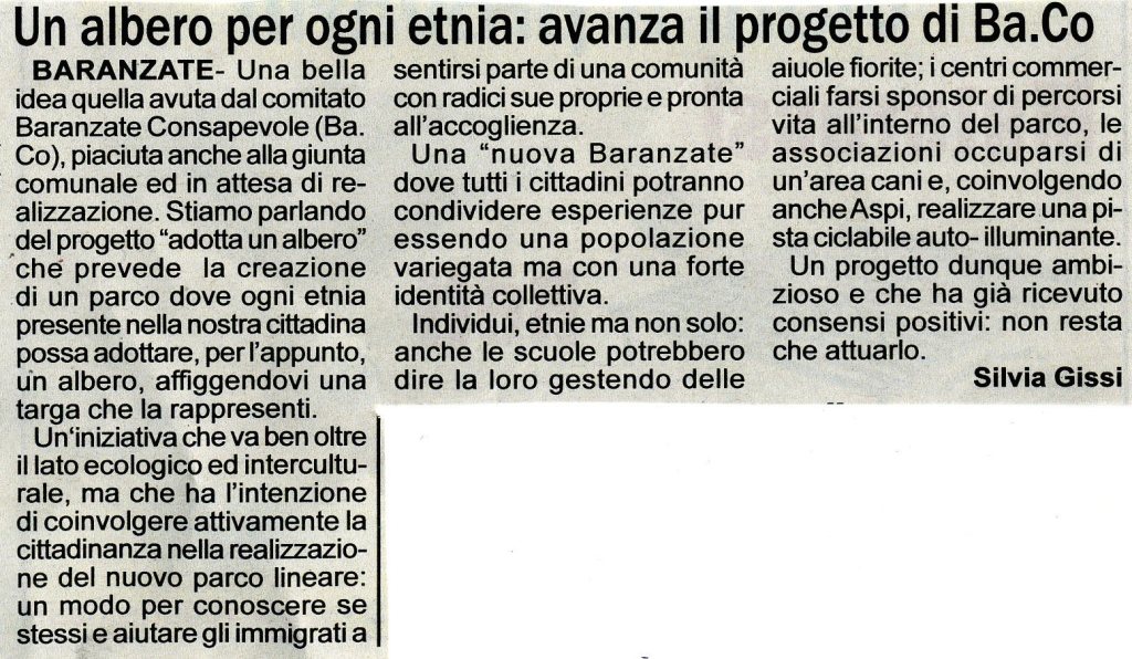 - L’adozione dei primi alberi da parte di ogni etnia presente sul nostro territorio, in modo che rappresenti il simbolo di integrazione reale di tutti i cittadini. Cartelli recanti una frase rappresentativa di ogni etnia, ricorderanno le diverse radici, ma ci faranno condividere l’essere tutti baranzatesi che vivono lo stesso territorio e la stessa voglia di essere una popolazione variegata ma dalla forte identità collettiva.