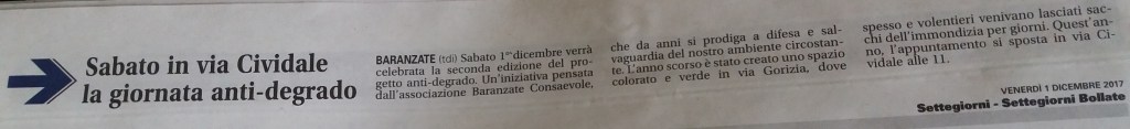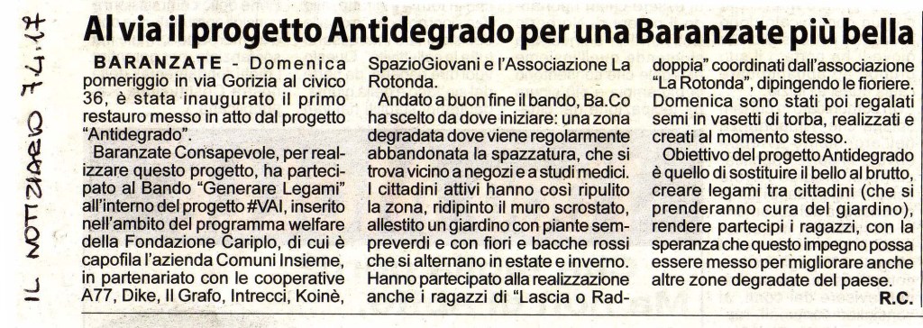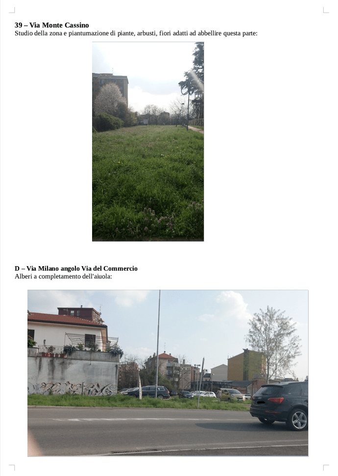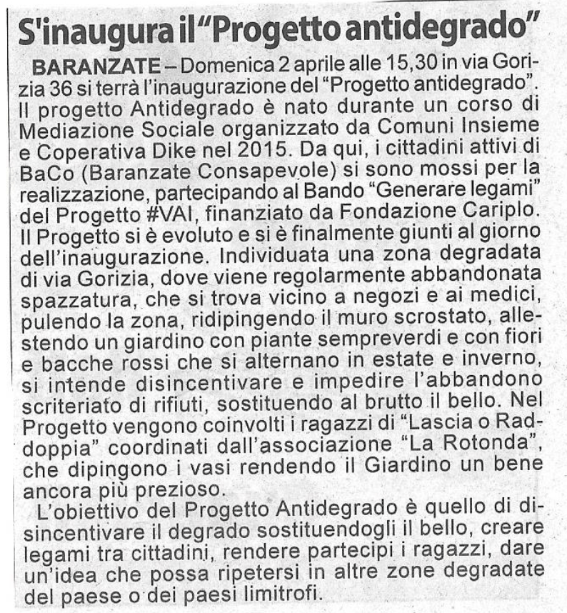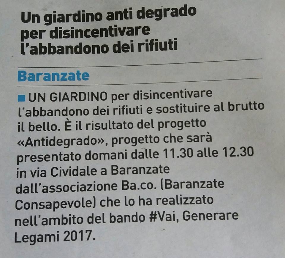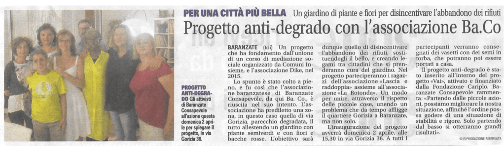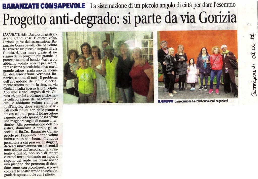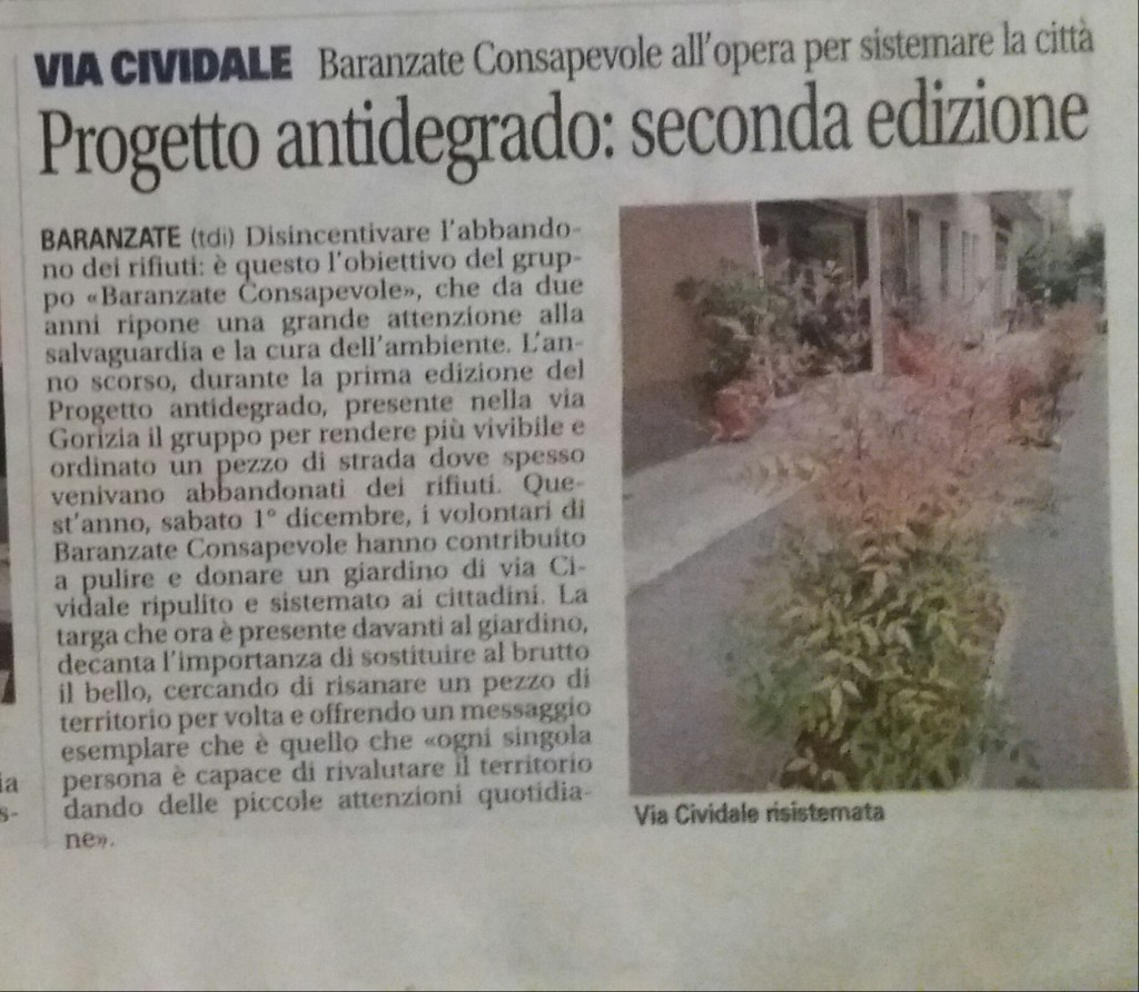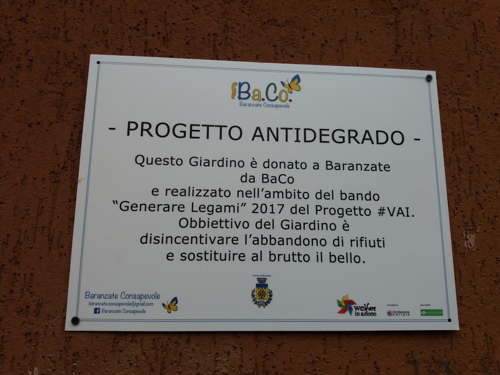 Il nostro Progetto si pone come primo obiettivo quello della “prevenzione e contrasto del degrado urbano legato all’abbandono dei rifiuti” su aree private e pubbliche del Comune di Baranzate. Abbiamo identificato le aree da riqualificare in Via Gorizia e in Via Cividale in angoli sempre riempiti di rifiuti urbani e ingombranti. Abbiamo inoltre curato l’aiuola in Piazza XXIII MAGGIO (piazza della Posta), ripulendola dalle erbacce, piantando e curando nuovi fiori, e piantato gelsomini sulla zona con panchine e monumento.