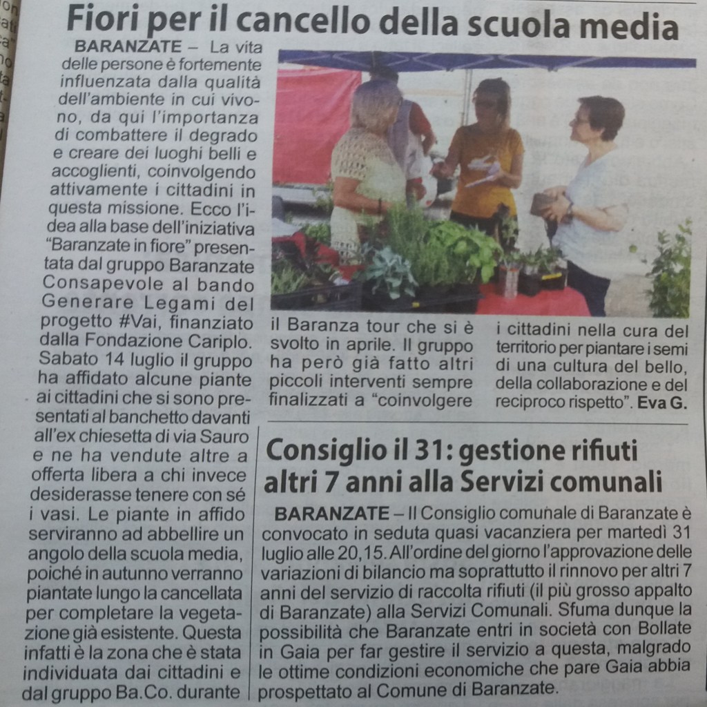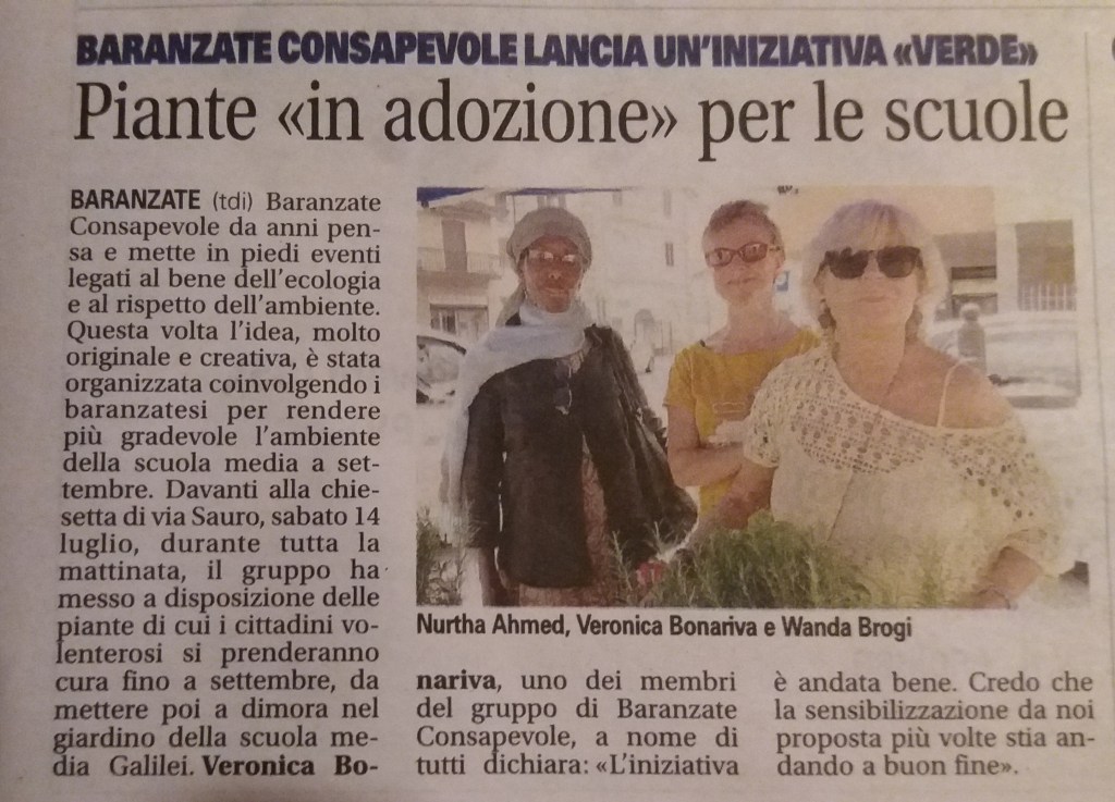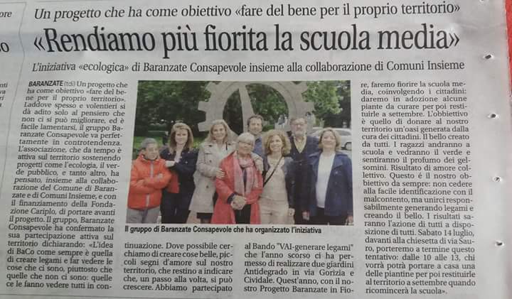 Il progetto continua la riqualificazione ambientale del territorio e il creare legami tra i le persone e le istituzioni. – visita del territorio mediante un “Baranzatour” (passeggiata di osservazione) seguendo la mappa delle zone verdi da migliorare. – individuate varie zone, ma scelta insieme al Comune la Scuola Media come zona da abbellire. – ricerca delle piante adatte alla zona, deciso per 30 photinie e 130 gelsomini da piantare lungo tutta la cancellata che dà su via Aquileia e via Milano. Aggiunti 9 Ligustrum per riempimento siepe che dà su via Monte Spluga. – evento in piazza durante il quale BaCo ha affidato a cittadini e Associazioni i gelsomini per prendersene cura per qualche mese, prima della messa a dimora a Scuola. – scavo per la messa a dimora delle piante. – i cittadini restituiscono al territorio le piante di cui si sono presi cura e le piante vengono messe a dimora. – i ragazzi del Progetto Orto Scolastico, con gli insegnanti e con il responsabile del Progetto Edoardo Smiriglia, si occupano della piantumazione dei gelsomini.