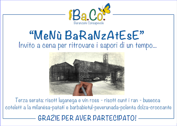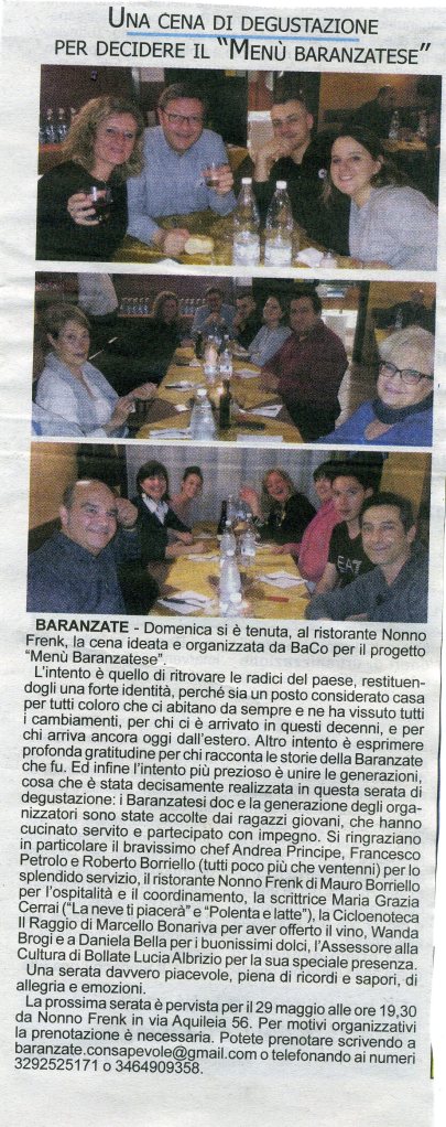 Ringraziamo tutti gli ospiti intervenuti, tantissimi, nelle quattro serate. Grazie alla scrittrice e amica Maria Grazia Cerrai. Grazie agli chef e Andrea Principe e Aldo Toso. Grazie a Francesco Petrolo e Roberto Borriello per il prezioso contributo al servizio in sala. Grazie al titolare del ristorante “Nonno Frenk” Mauro Borriello. E grazie ai baranzatesi della vecchia generazione per aver condiviso con noi le loro storie e averci emozionati.