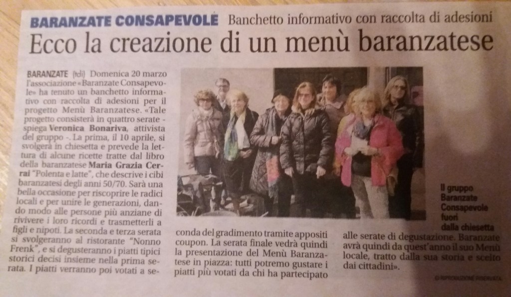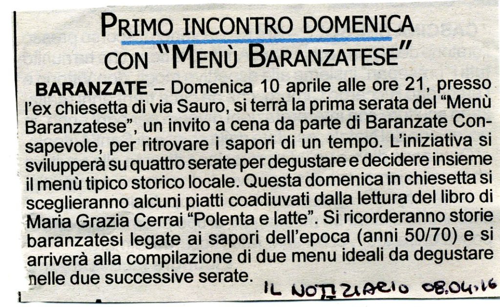 In seguito all’evento “Storie baranzatesi”, abbiamo pensato ad un altro evento aggregativo, sempre valorizzando i baranzatesi doc e prendendo spunto dal libro “Polenta e latte” di Maria Grazia Cerrai, tra i nostri ospiti.