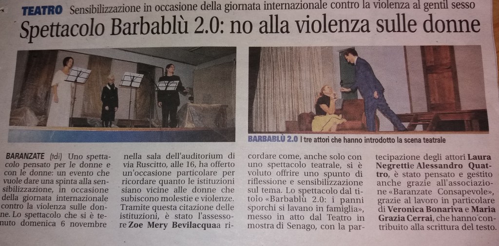 Il nostro contributo: una lettura interpretata da Lumen Teatro (Stefano Tenconi, Angela Volpicella, Antonella Manunta) e scritta da Veronica Bonariva e la scrittrice Maria Grazia Cerrai. E’ stata l’introduzione al bellissimo spettacolo teatrale “Barbablù 2.0” di teatro in Mostra, con Laura Negretti e Alessandro Quattro.